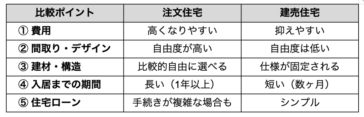 ここからは、家づくりで特に気になる5つのポイントごとに、注文住宅と建売住宅を徹底比較します。まずは、比較内容を一覧で紹介しましょう。どちらが自分の希望に近いかを考えながらご覧ください。【ポイントごとの比較】注文住宅と建売住宅の違い