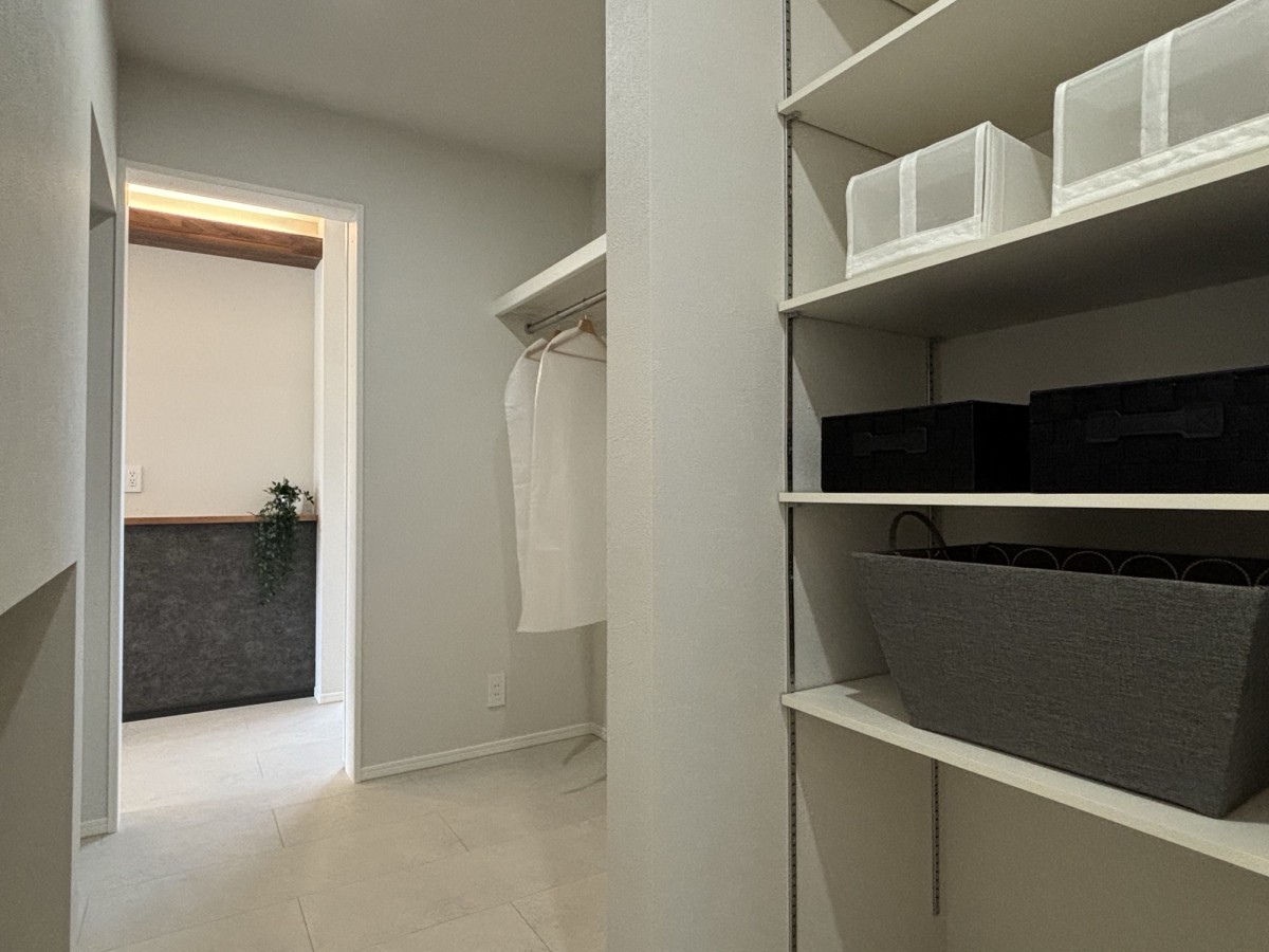 キッチンからファミリークローゼット、洗面室、脱衣室へと続くスムーズな動線を確保。