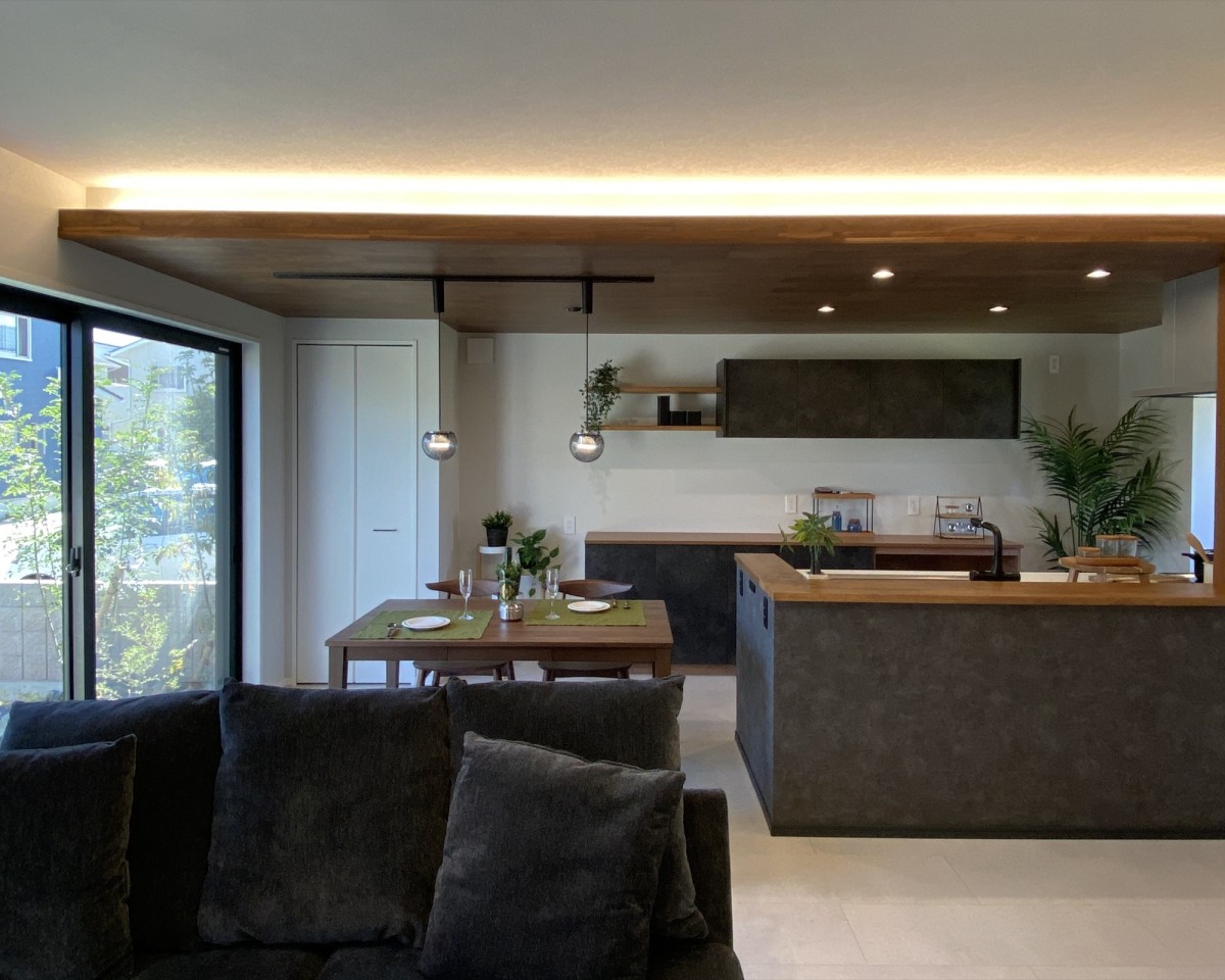 自然素材のぬくもりあふれる風合いが家族団らんの空間を優しく包み込み、心が安らぐひとときを演出します。