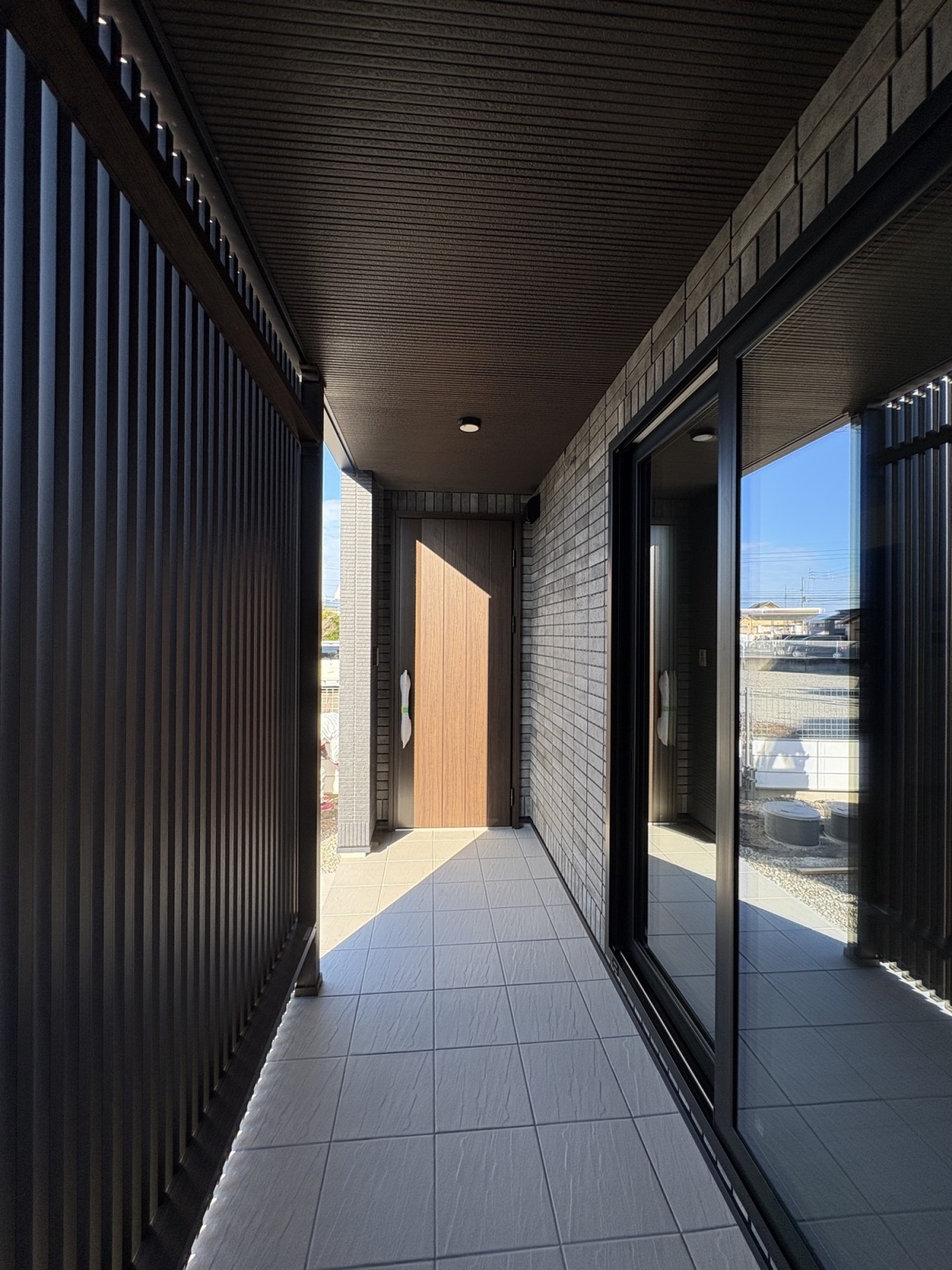 道路からの視線が気にならないよう、リビングの大きな窓の前には目隠しとなる縦格子のルーバーフェンスを設置しました。