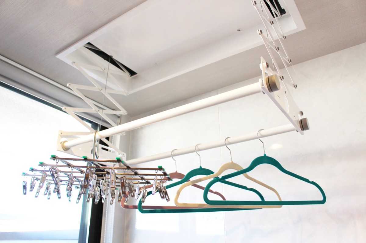 室内干しが基本のご家庭におすすめなのが、天井埋め込み型などの「室内干しユニット」です。必要なときだけ竿を天井から下ろして使い、使わないときは天井にすっきりと収納できるため、スペースを圧迫せず、見た目も損ないません。